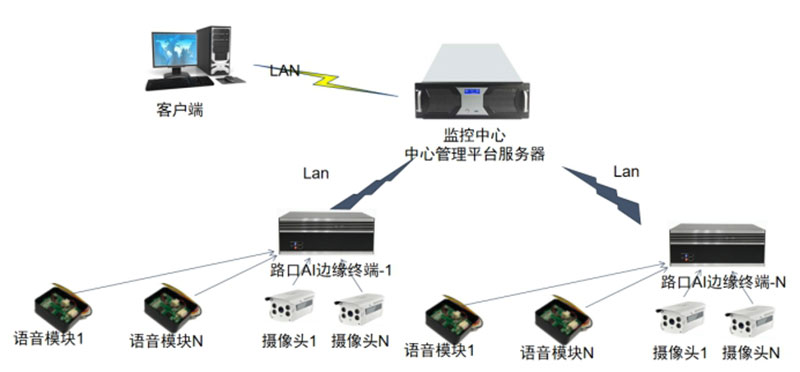 由于本项目监控场所与中心网络如果采用有线方式,因此适合采用后台部署并集中管理方式,如果摄像头端无专线网络则可采用4G方式,本地分析后上传抓拍记录到云端平台,即采用分布式部署+集中式管理的方式,即在现场安装AI边缘计算设备,接入1-N路网络摄像头,监控中心部署中心管理平台软件,集中管理所有的AI边缘计算设备